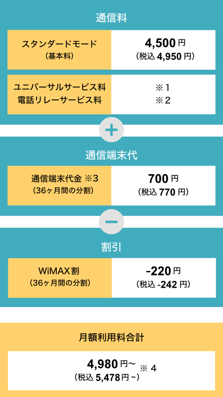 月額利用料合計にユニバーサルサービス料と電話リレーサービス料が別途加算されます。