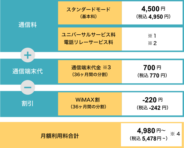 月額利用料は、通信料・通信端末代・割引の合計となります。