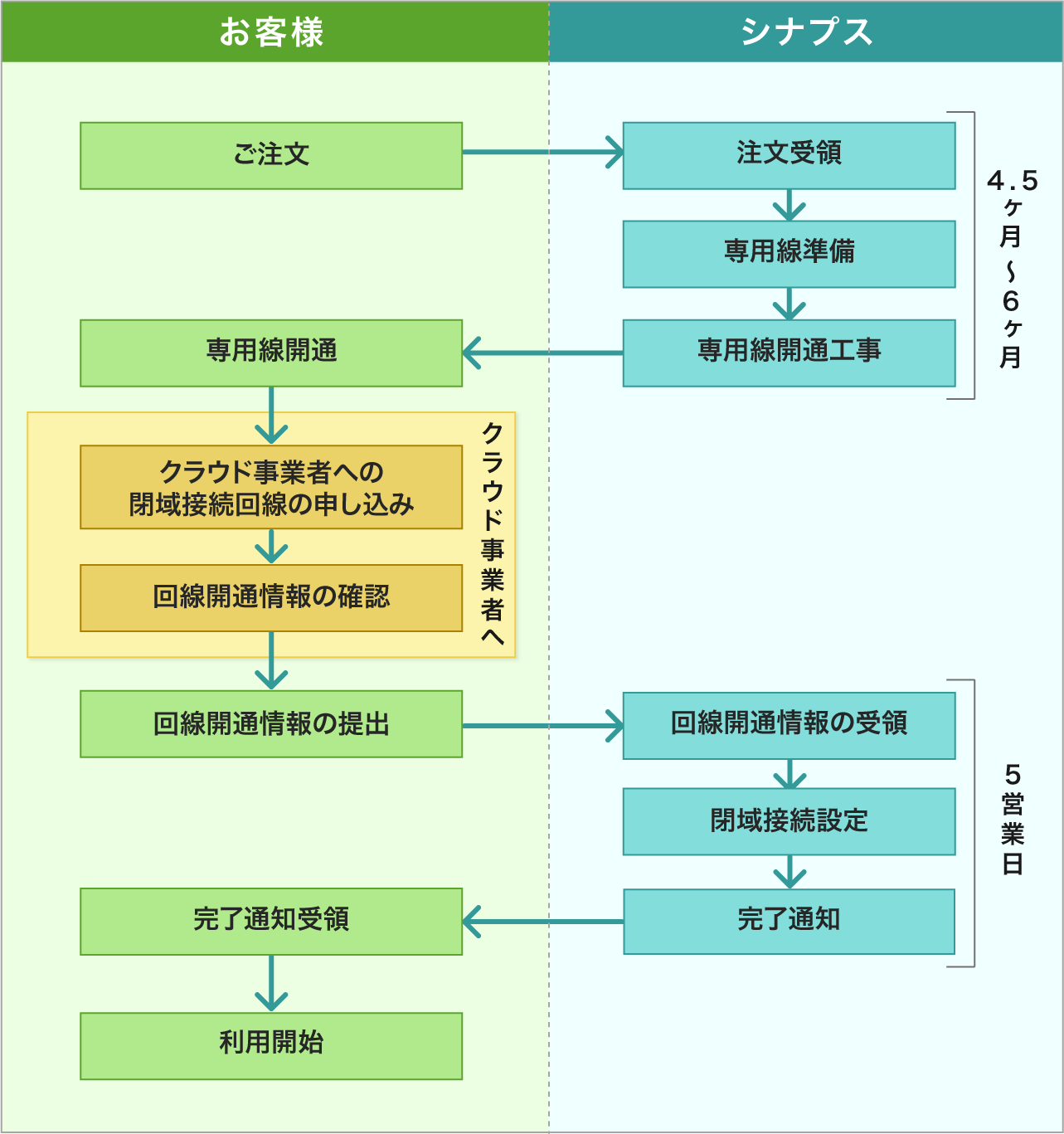 お客様からご注文いただいた後、専用線開通工事完了まで6ヶ月ほどかかります。その後回線開通情報をシナプスへご提出いただいた後に1週間程度かかります。ご利用開始予定日の半年以上前を目安にご相談ください。