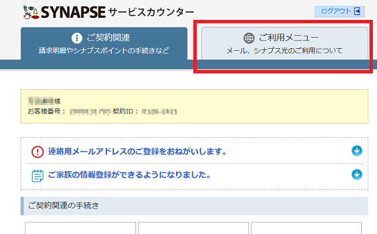 契約ID 、契約IDパスワードが不明の場合は、パスワード請求フォームからご請求ください。 - 画面上部にある「ご利用メニュー」をクリックします