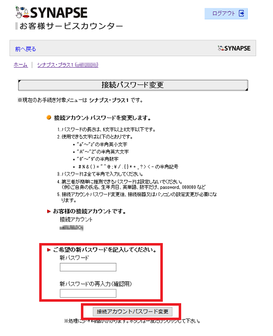 - ご希望の新パスワードを入力し「接続アカウントパスワード変更」をクリックします
